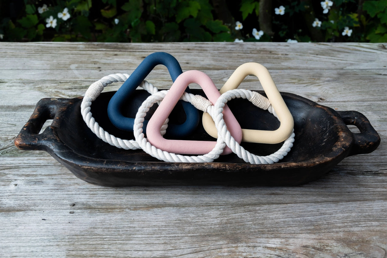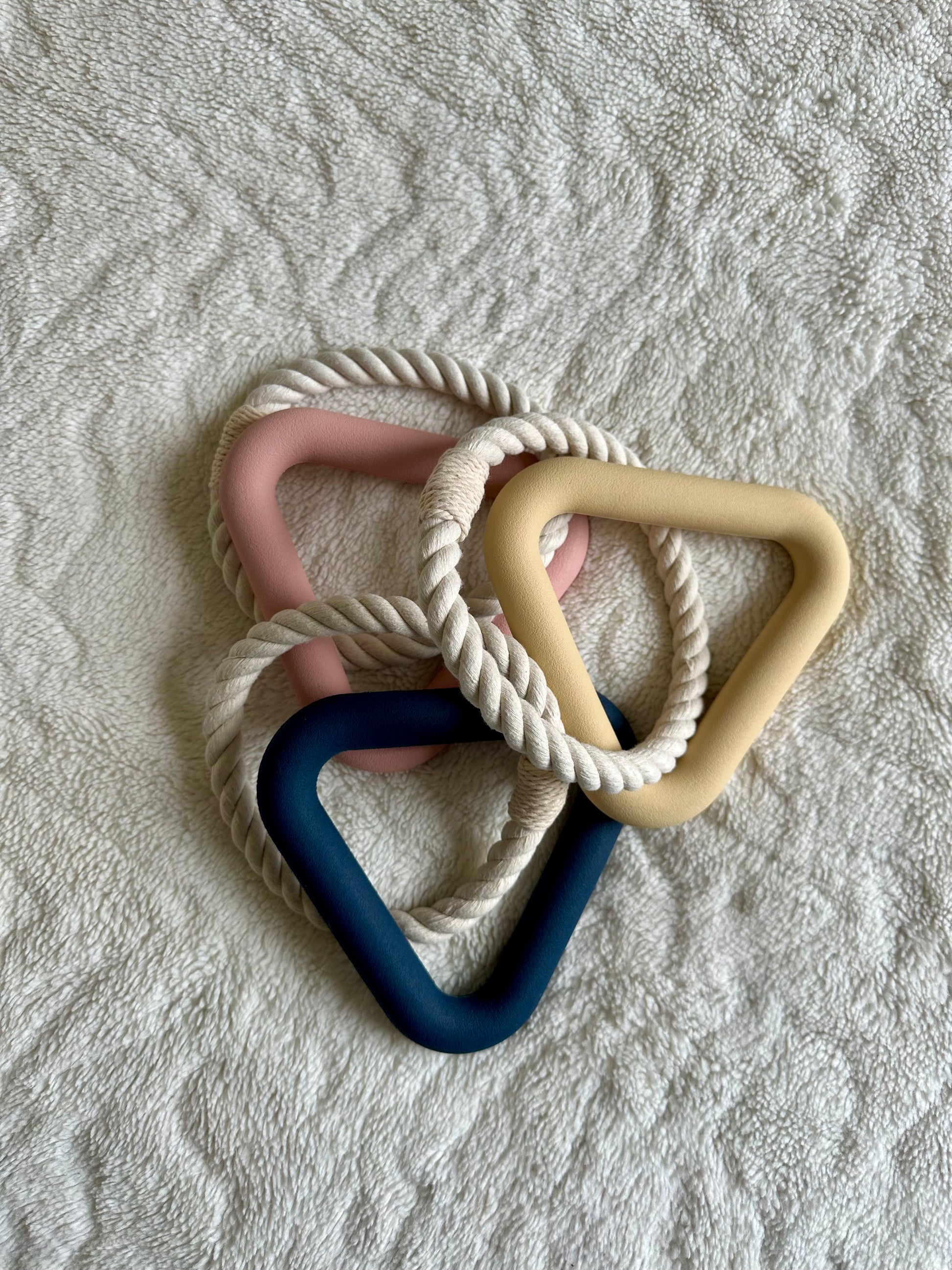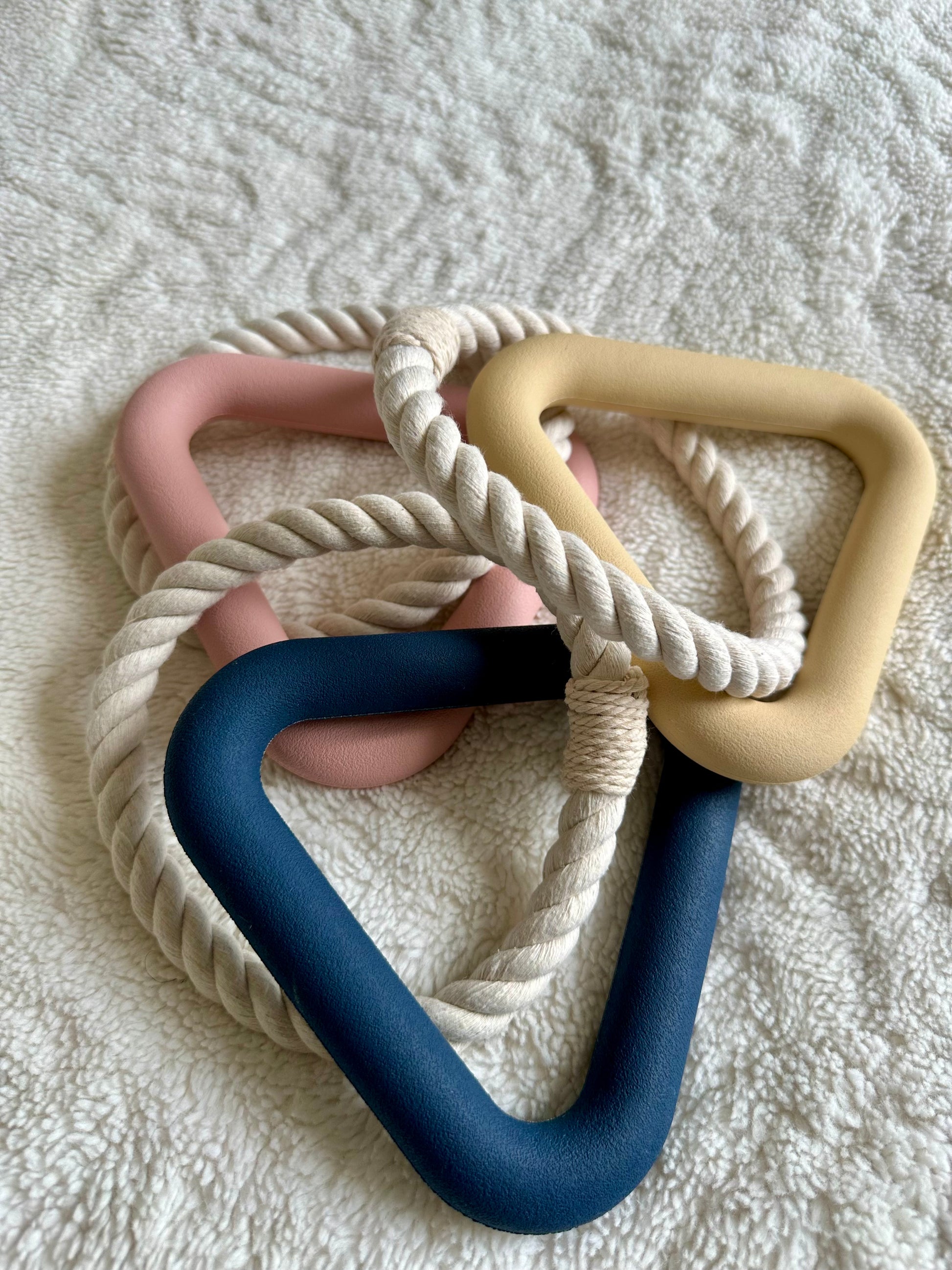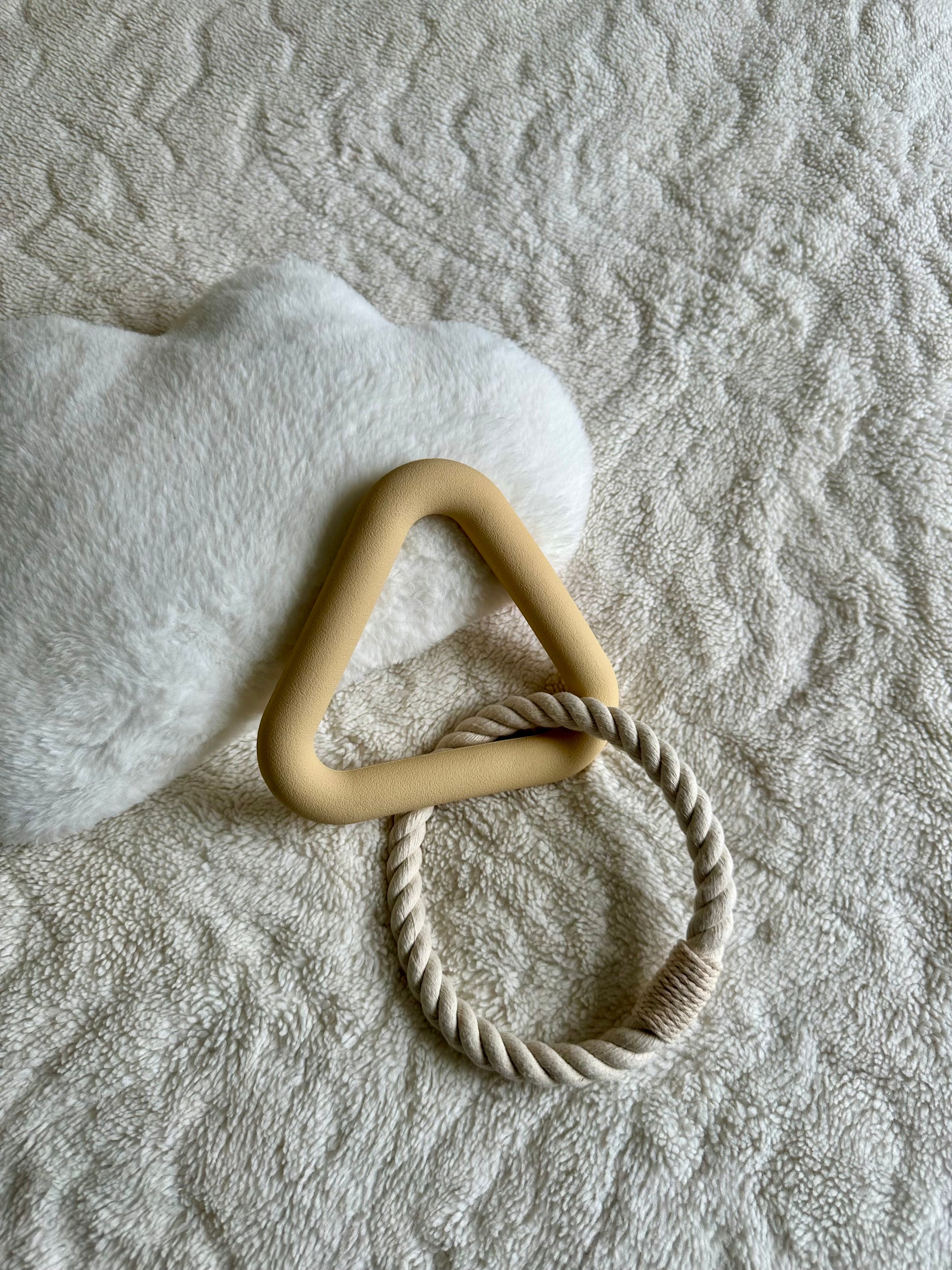 Le triangle à mâcher est fabriqué en corde tressée et en caoutchouc naturel, résistant et durable.